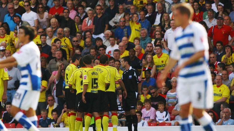GHOST GOAL: Referee Stuart Attwell is surrounded by Watford players after he incorrectly awarded a goal to Reading. Picture: Ian Walton/Getty Images