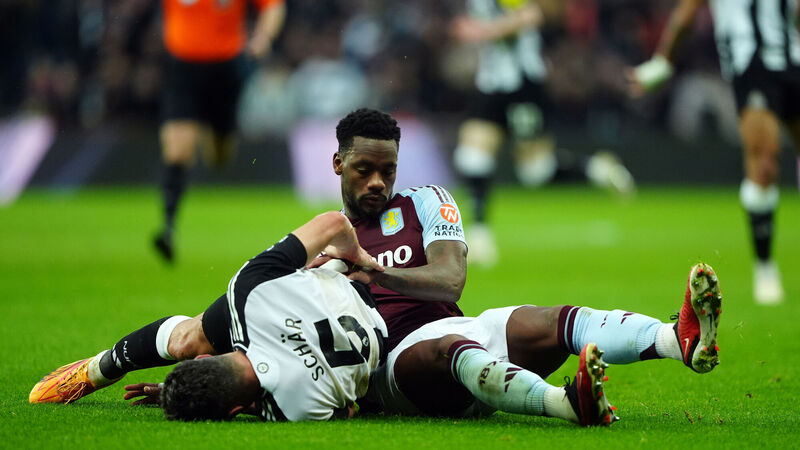 HIS HEAD'S JHON: Newcastle United's Fabian Schar (left) after being fouled by Aston Villa's Jhon Duran (right) leading to a red card during the Premier League match at St. James' Park, Newcastle upon Tyne. Pic: Owen Humphreys/PA Wire.]