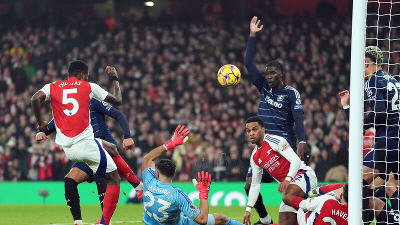 Arsenal's Thomas Partey has a shot blocked by Aston Villa goalkeeper Emiliano Martinez. Pic:Zac Goodwin/PA Wire.