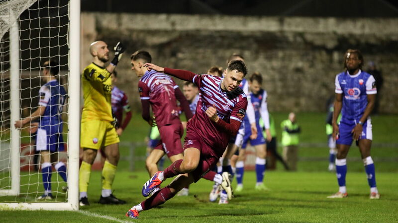Cian Coleman of Cobh Ramblers celebrates after scoring his side's first goal. Photo by Michael P Ryan/Sportsfile