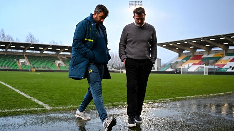 Tim Clancy and Stephen Bradley after the postponement of the SSE Airtricity Men's Premier Division match between Shamrock Rovers and Cork City at Tallaght Stadium. Pic: Seb Daly/Sportsfile.