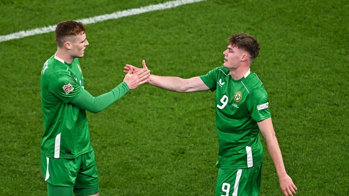 GREEN SHOOTS: Evan Ferguson of Republic of Ireland, right, celebrates with team-mate Jake O'Brien after scoring their side's first goal during the UEFA Nations League B/C Play-off 2nd Leg match between Republic of Ireland and Bulgaria at the Aviva Stadium in Dublin. Pic: Sam Barnes/Sportsfile