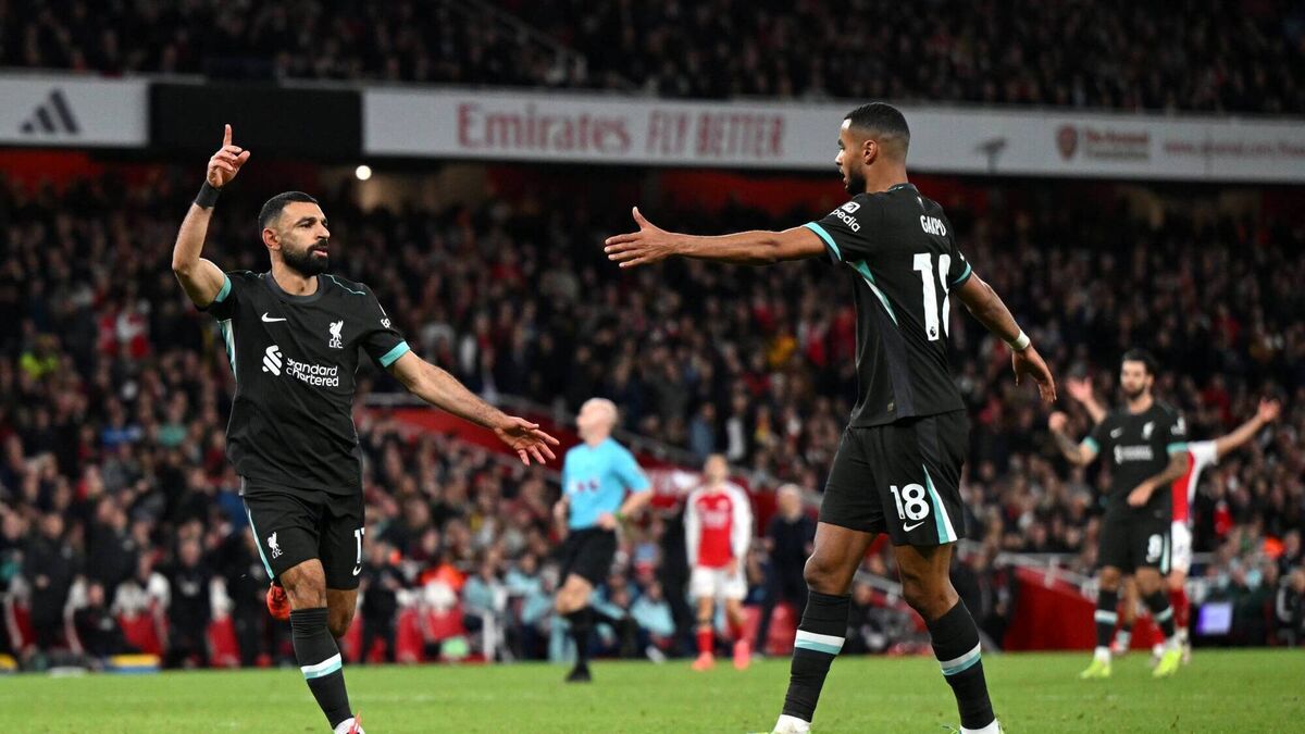 Mohamed Salah of Liverpool celebrates with Cody Gakpo after scoring his team's second goal during the Premier League match between Arsenal FC and Liverpool FC at Emirates Stadium on October 27, 2024 in London, England. (Photo by Shaun Botterill/Getty Images)