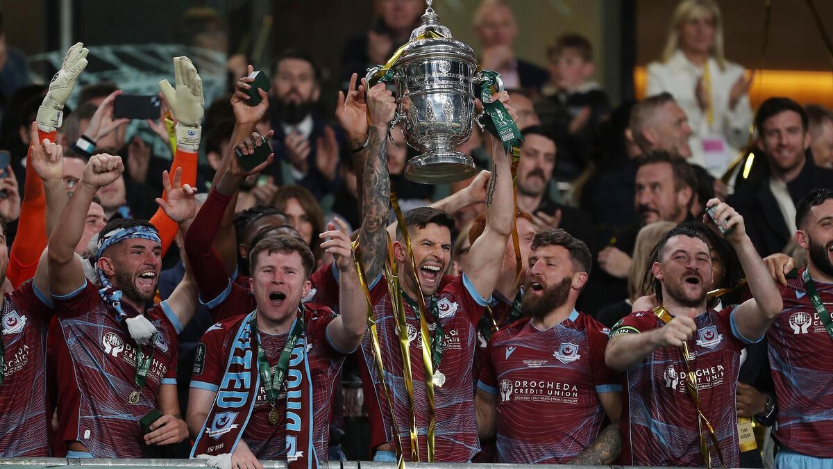 Drogheda’s Adam Foley lifts the FAI Cup last year. Pic: Lorcan Doherty/Inpho