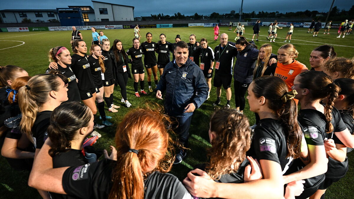 Athlone Town manager Colin Fortune speaks to his players after the UEFA Women's Champions League First Qualifying Round semi-final between Cardiff City and Athlone Town. Pic: Stephen McCarthy/Sportsfile