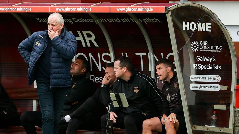 NEW SIDELINES LOOK: Galway United manager John Caulfield, left, and assistant manager Jon Daly, second from right, during the SSE Airtricity Men's Premier Division match between Galway United and Shamrock Rovers at Eamonn Deacy Park in Galway. Pic: Thomas Flinkow/Sportsfile