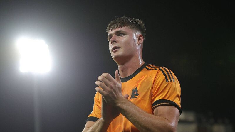 Roma's Evan Ferguson thanks the fans after the Serie A win over Pisa SC. Photo by Gabriele Maltinti/Getty Images