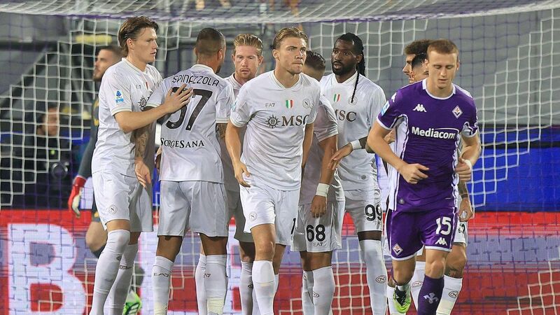 Napoli's Kevin De Bruyne, with Scott McTominay left, celebrates after scoring a goal during the Serie A match with Fiorentina at Artemio Franchi on September 13, 2025 in Florence, Italy. (Photo by Gabriele Maltinti/Getty Images)