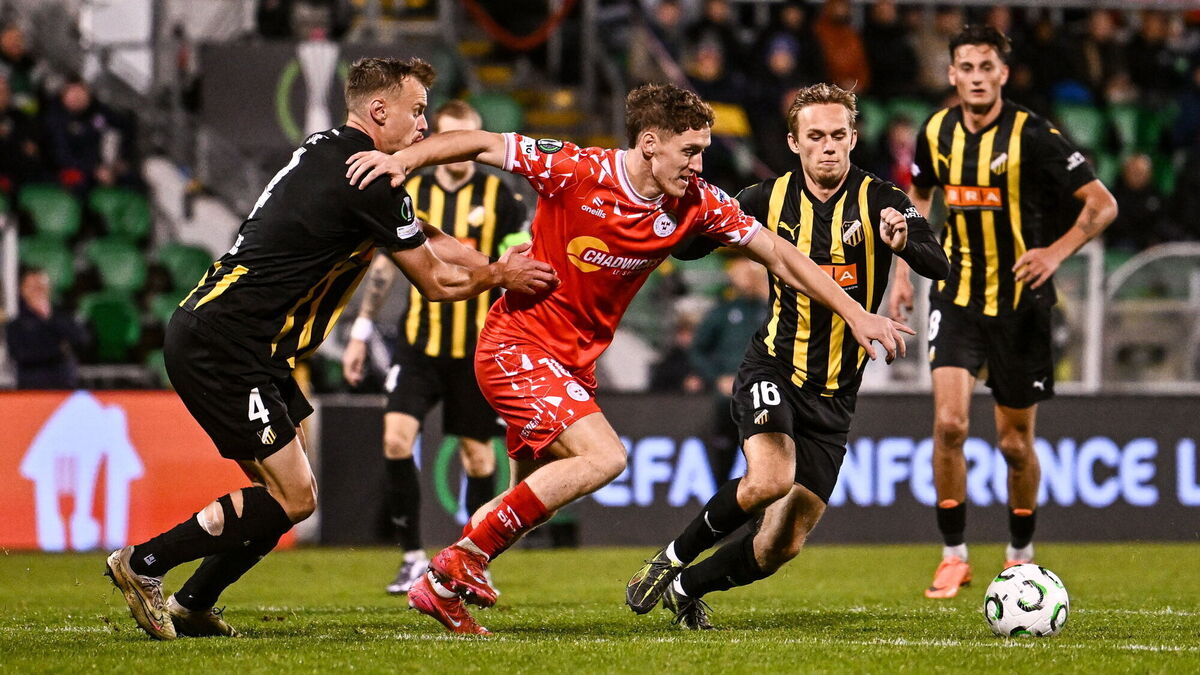 POINT SECURED: Shels John Martin in action against Hacken's Marius Lode, left. Pic: Ben McShane/Sportsfile