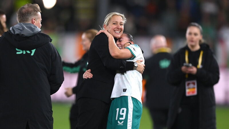 Republic of Ireland head coach Carla Ward and Abbie Larkin of Republic of Ireland celebrate. Pic: Stephen McCarthy/Sportsfile
