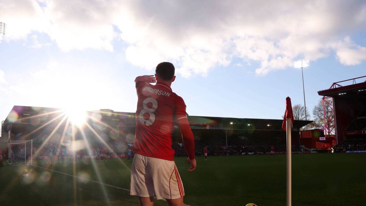 SEEING THE LIGHT: Elliot Anderson of Nottingham Forest shields his eyes from the sun as he takes a corner kick during the Premier League match between Nottingham Forest and Brighton & Hove Albion at City Ground on November 30, 2025 in Nottingham, England. (Photo by Carl Recine/Getty Images)