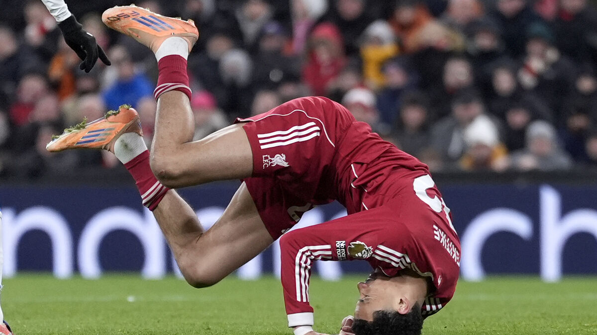 OUCH: Liverpool striker Hugo Ekitike takes a tumble during the game against Leeds. Picture: Peter Byrne/PA