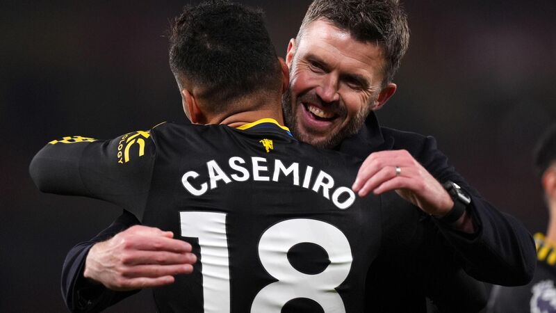 Manchester United manager Michael Carrick celebrates the win at Arsenal with Casemiro. Pic: Mike Egerton/PA Wire.