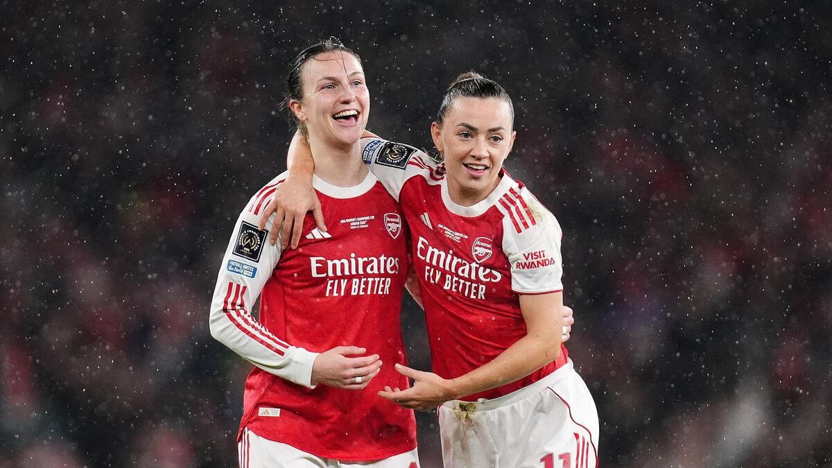 WORLD CHAMPS: Arsenal's Lotte Wubben-Moy celebrates with Katie McCabe. Pic: John Walton/PA Wire.