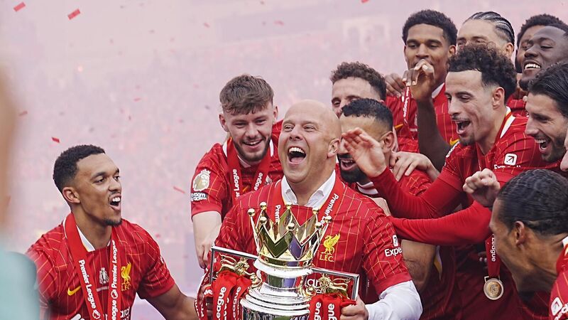 Liverpool manager Arne Slot lifts the Premier League trophy with the players. Picture date: Sunday May 25, 2025.