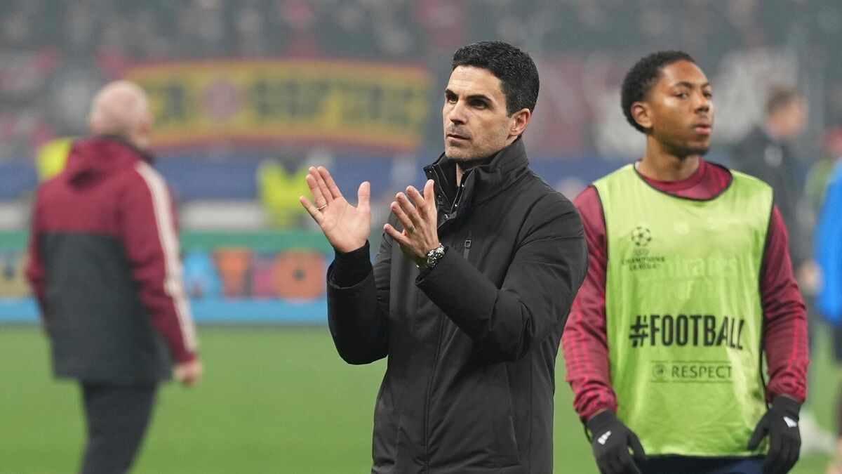 Arsenal's manager Mikel Arteta applauds his team's fans after the Champions League round of 16 first leg soccer match at Bayer Leverkusen. Pic: AP Photo/Martin Meissner