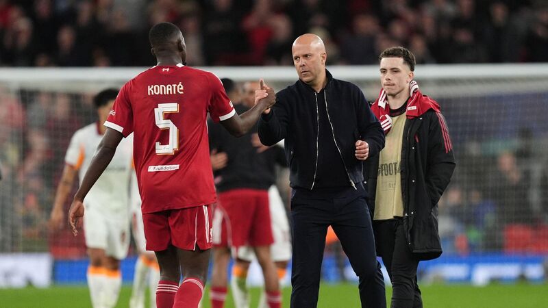Liverpool manager Arne Slot celebrates with Ibrahima Konate. Pic: Martin Rickett/PA Wire.