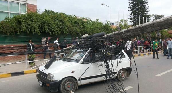 Riding through Kathmandu. Thousands remain on the streets. Safer in open. Wires & buildings down #earthquake #nepal pic.twitter.com/Ba77TY71AV