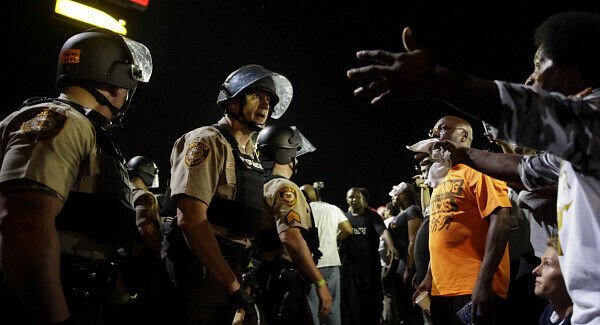 A tense moment came on Tuesday when a few dozen people briefly blocked traffic. But several officers in riot gear, along with St Louis County police chief Jon Belmar, quickly moved to break it up. Police said they made no arrests.