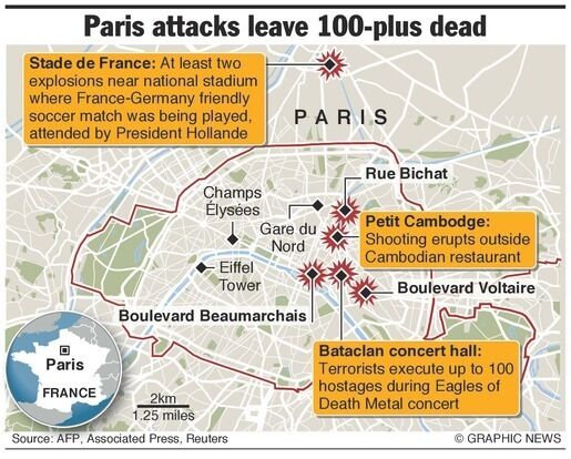 Shootings and explosions happened at six separate locations.