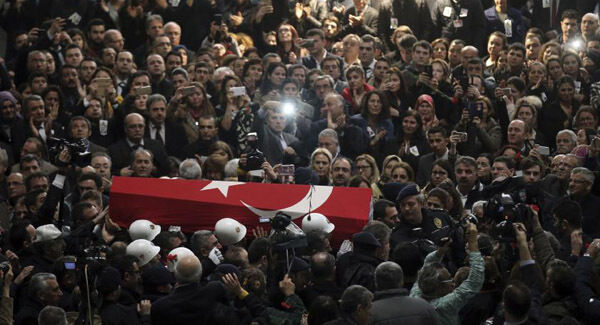 Mr Bozdag spoke before thousands of people attended a memorial service for the killed police officer, Fethi Sekin, who authorities say thwarted a larger attack.