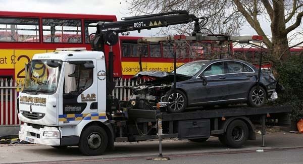 The crash happened outside a car wash opposite a row of shops on Bromley Road, with the Mercedes appearing to have come off the road and careered through a row of bollards before hitting a low wall at the end of a hedge.