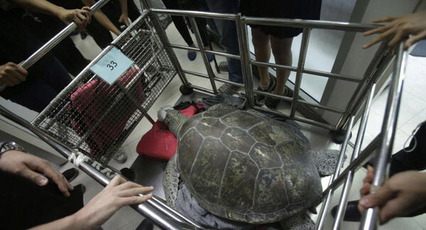 Veterinarians in Bangkok put "Bank", as the green sea turtle is nicknamed, back into the water to see how well she could move after 5kg (11lbs) of coins was taken from its stomach.