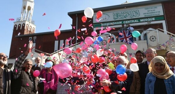 The open-to-all gathering at Birmingham's Central Mosque, which saw the building decked out with Union Flag bunting, was organised in response to an EDL event being held today in the city centre.