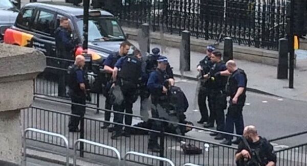 The bearded suspect, who was dressed in dark clothing, was wrestled to the ground on a traffic island at the Parliament Square end of Whitehall, close to the Foreign Office and the entrance to Downing Street.