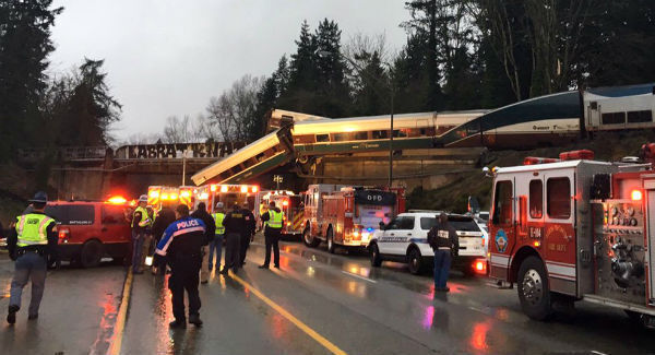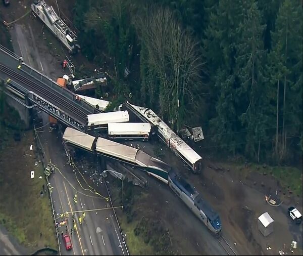 Authorities say at least three people were killed and dozens injured when the train derailed early on Monday morning, spilling train carriages onto the busy Interstate 5 road.
