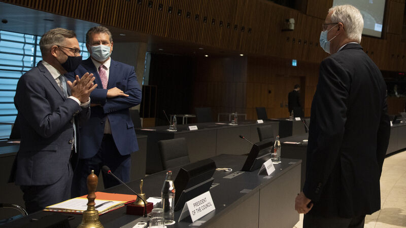 European Commission’s Head of Task Force for Relations with the United Kingdom Michel Barnier, right, speaks with Minister of State for Europe at the German Federal Foreign Office Michael Roth, left, and European Commissioner for Inter-institutional Relations and Foresight Maros Sefcovic during a meeting of EU General Affairs ministers at the European Council building in Luxembourg. (AP Photo/Virginia Mayo, Pool)