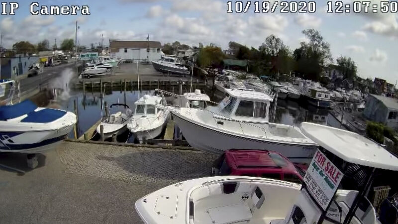 Seven people, including two police officers, jumped into the water in Long Island, New York, to save the couple in a rescue that was captured on security video.