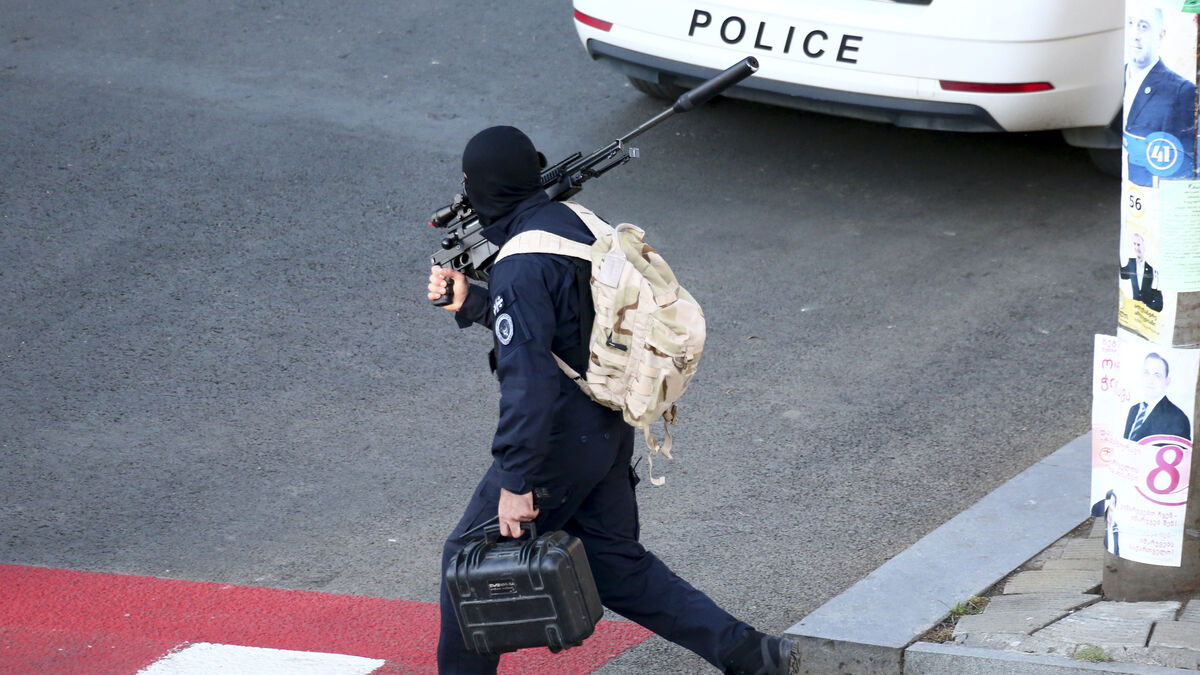 Police in the ex-Soviet republic of Georgia are hunting a bank robber who held more than 40 people hostage for hours before releasing them and escaping with the equivalent of €418,895 in cash given to him by authorities.