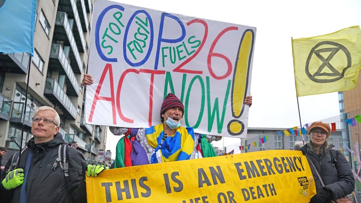Climate Justice Activists at the Cop26 Gates asking delegates as they make final decisions, "Are You With Us Or With Fossil Fuels?" during the final day of the Cop26 summit in Glasgow which has now drifted into overtime and is set to continue today. Picture date: Friday November 12, 2021.