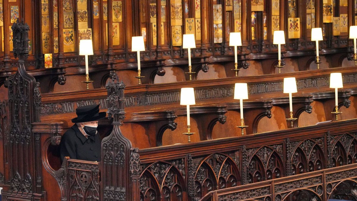 Britain's Queen Elizabeth attended the funeral of Philip, her husband of 74 years, wearing a face mark and socially distanced from her family at Windsor Castle in line with Covid restrictions.