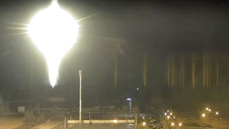 An image released by Zaporizhzhia nuclear power plant shows bright flaring objects landing in the grounds of the nuclear plant in Enerhodar, Ukraine Friday, March 4, 2022.