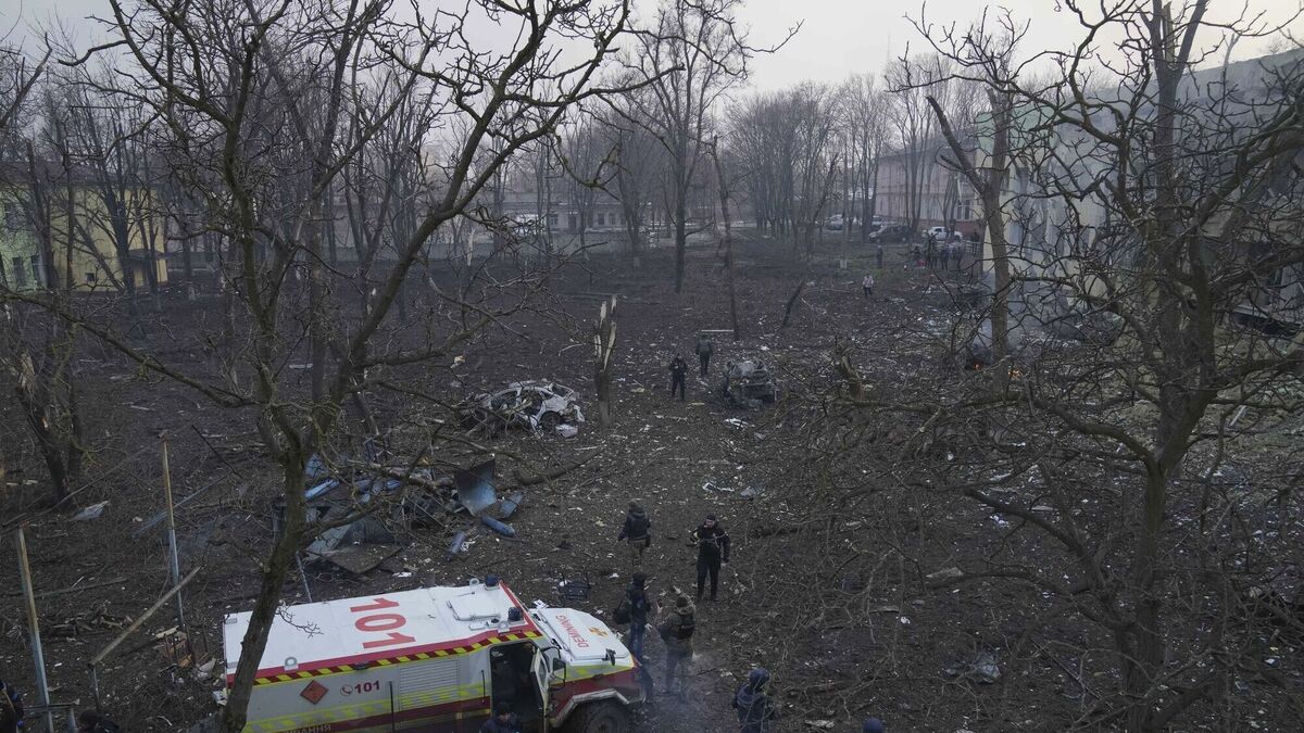 Ukrainian emergency employees work at the side of the damaged by shelling maternity hospital in Mariupol, Ukraine on Wednesday. Picture: AP Photo/Evgeniy Maloletka