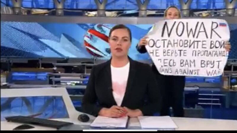 Maria Ovsiannikova, an editor at the channel, appeared in the background of one of Channel 1’s national news bulletins earlier this evening.