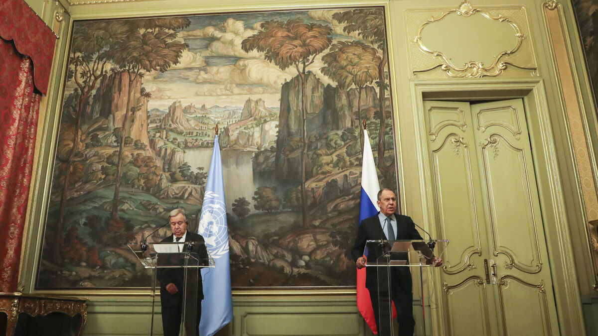 Russian Foreign Minister Sergey Lavrov, right, and UN Secretary-General Antonio Guterres attend a news conference during their meeting in Moscow, Russia. Picture: Maxim Shipenkov/Pool Photo via AP