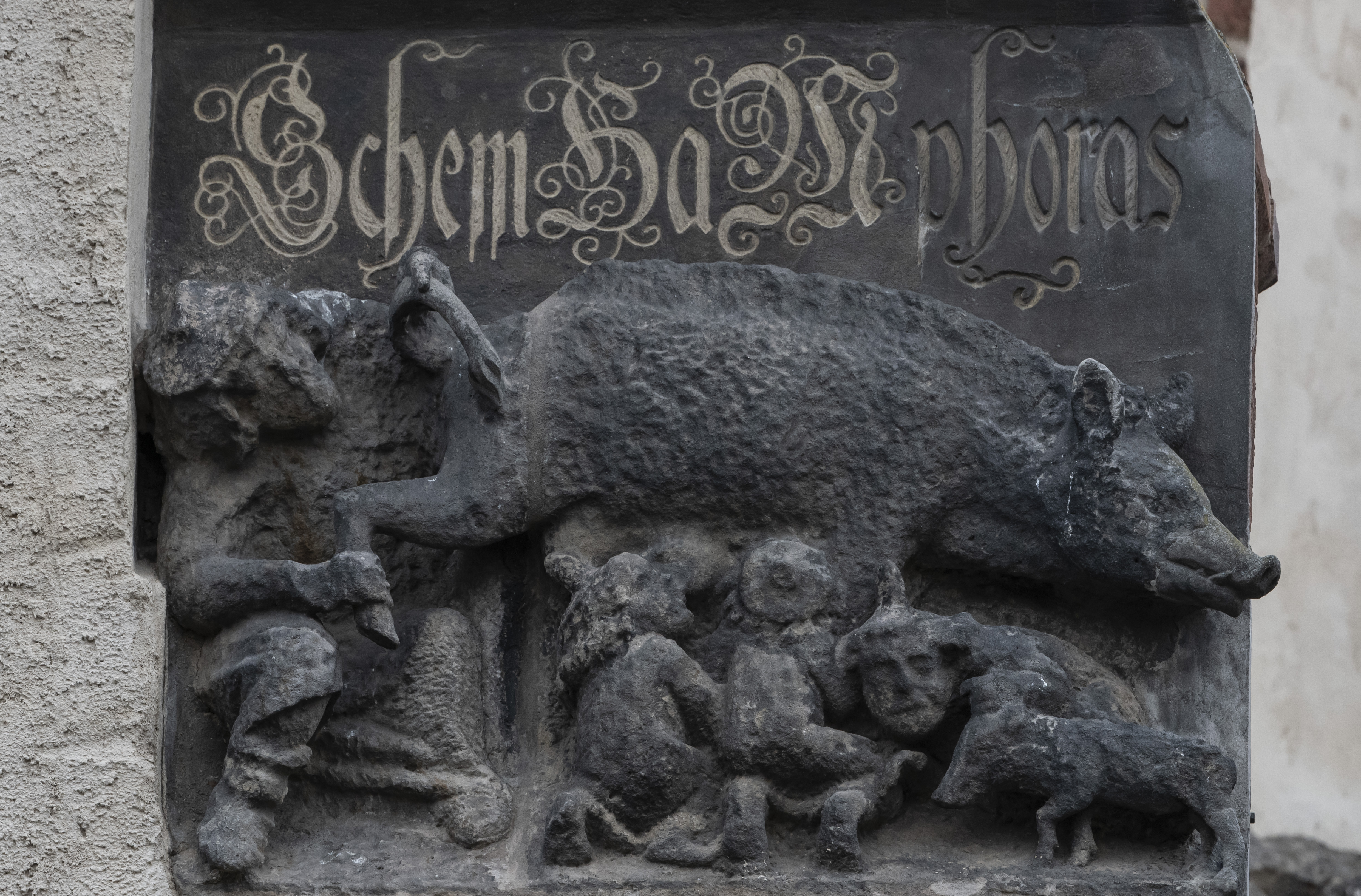 Placed on the church about 13ft above ground level, the sculpture depicts people identifiable as Jews suckling the teats of a sow while a rabbi lifts the animal’s tail.