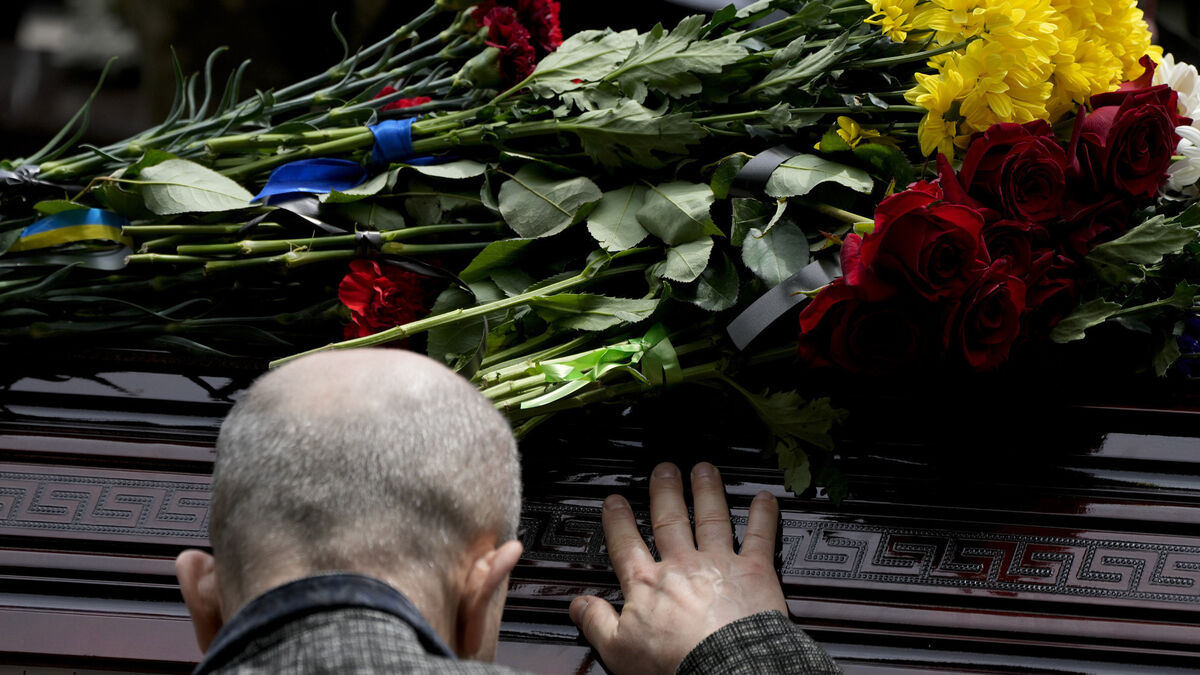 A man touches the coffin of activist and soldier Roman Ratushnyi during his funeral in Kyiv (AP)