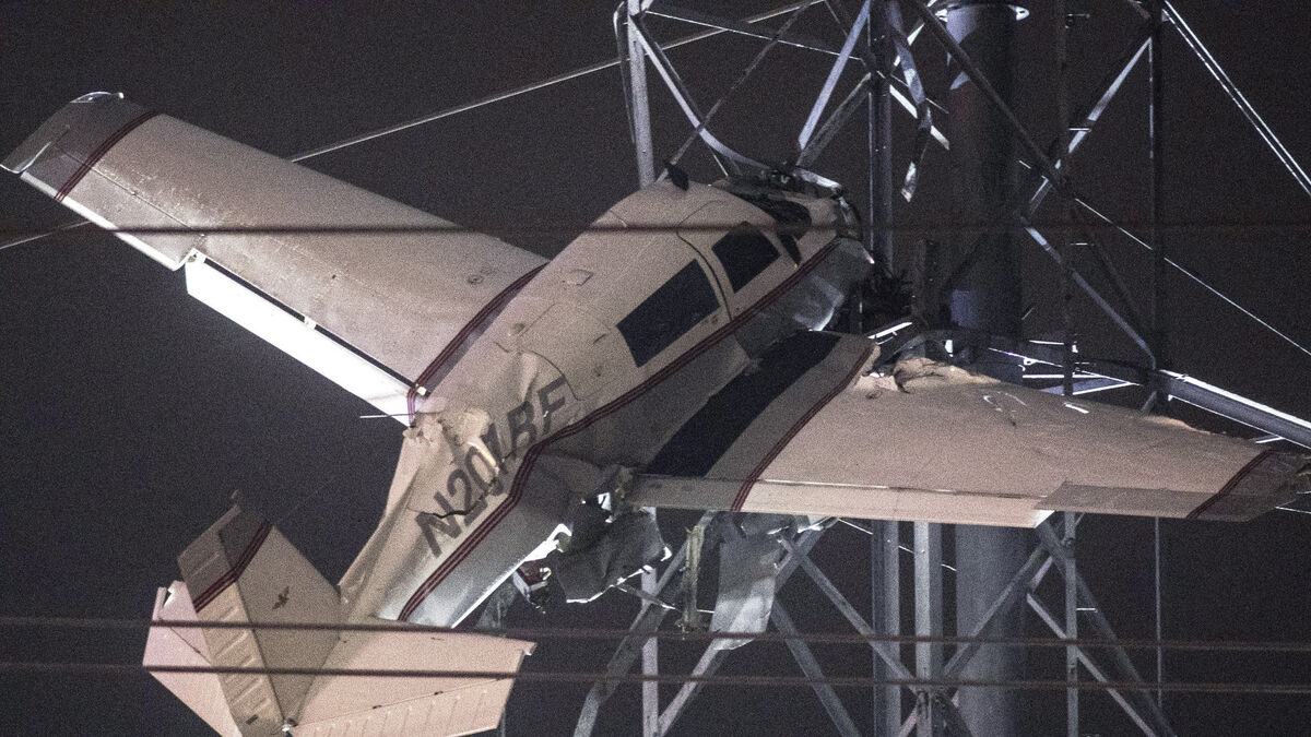 Video footage showed a small white plane positioned with its nose up near a pylon. A local television station’s live video showed the plane remained stuck in the transmission tower after 8pm.