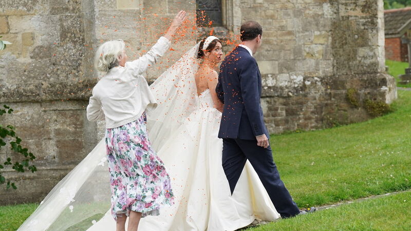 A woman believed to be a Just Stop Oil protester throws orange confetti over former chancellor George Osborne and his wife Thea Rogers (Stefan Rousseau/PA)