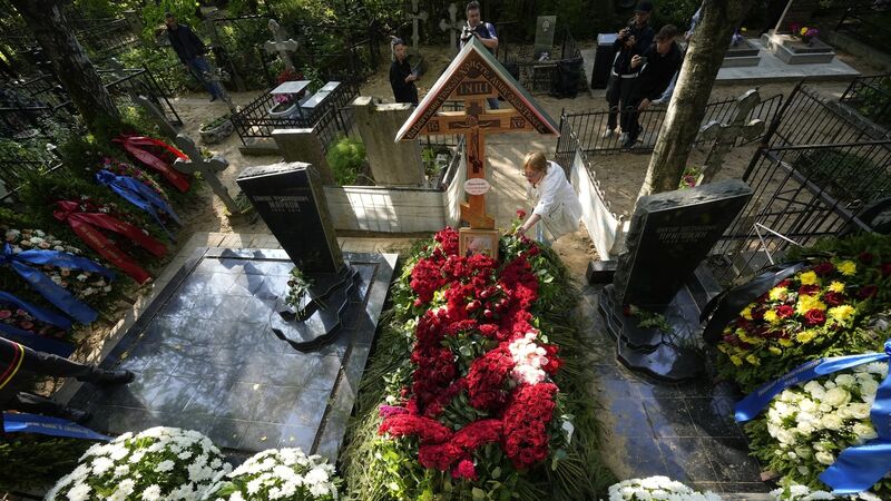 A woman lays flowers on the grave of Wagner Group’s chief Yevgeny Prigozhin (AP)