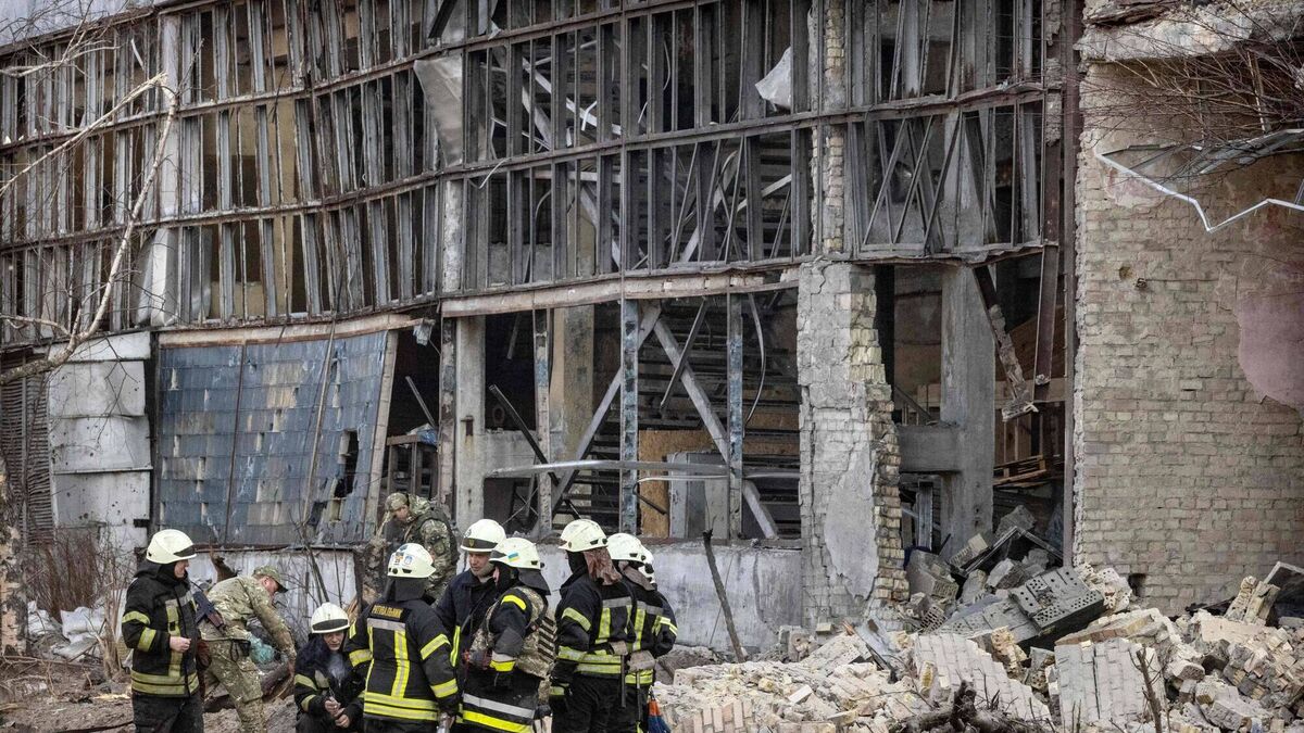 Firefighters at a research institute, part of Ukraine's National Academy of Science, after a strike by drones in northwestern Kyiv in March 2022. Photo: Fadel Senna/AFP via Getty Images