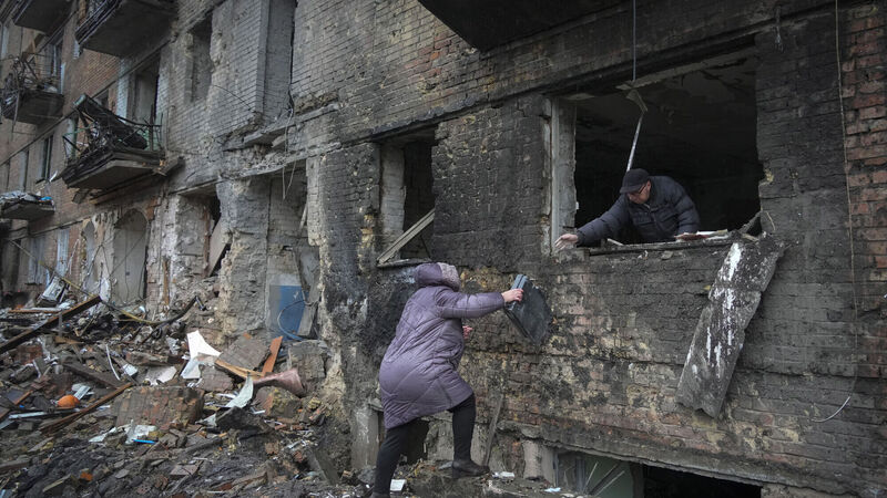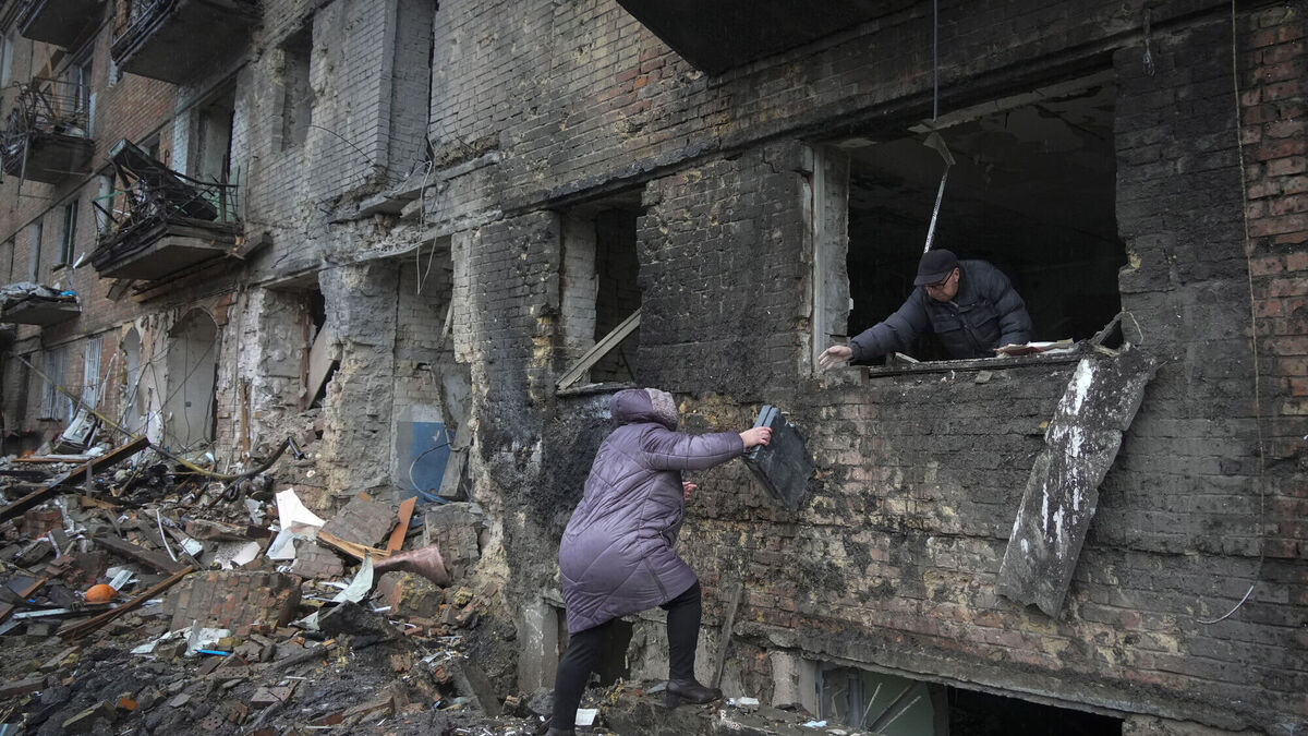 People gather their belongings from a damaged house after Russian shelling in the town of Vyshgorod outside the capital Kiev, Ukraine,