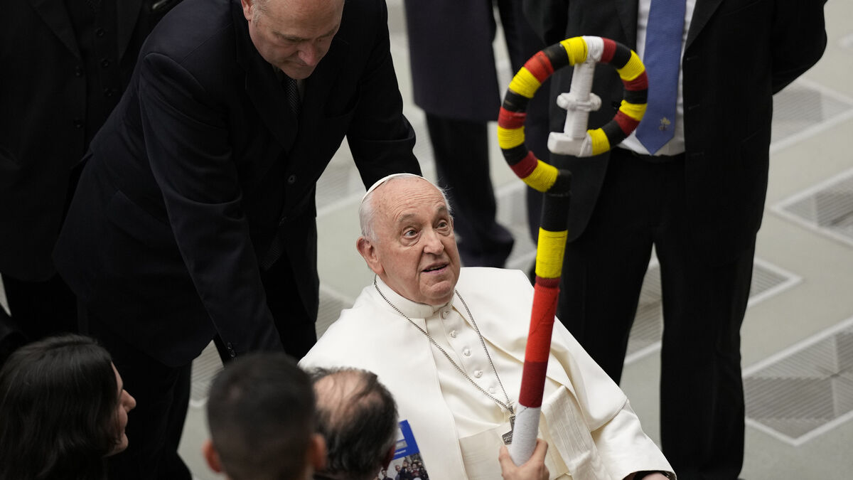 The Pope was pushed in a wheelchair into the audience hall at the Vatican on Wednesday, appearing weary as he dropped heavily into his seat.