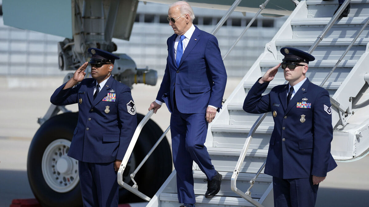 President Joe Biden arrives at Chicago O'Hare International Airport to attend a political fundraiser, Wednesday, May 8, 2024, in Chicago. (AP Photo/Evan Vucci)