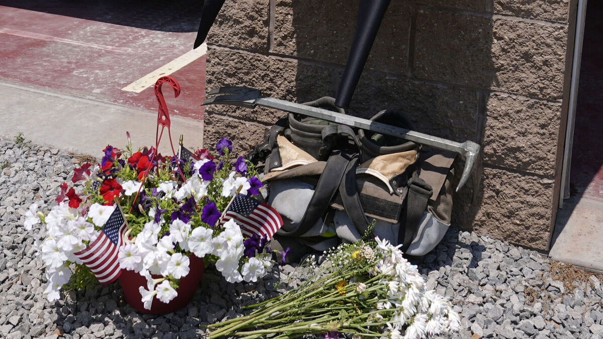 Flowers and a tribute to fallen firefighter Corey Comperatore are pictured at the Buffalo Township Volunteer Fire Company in Buffalo Township Picture: AP Photo/Sue Ogrocki