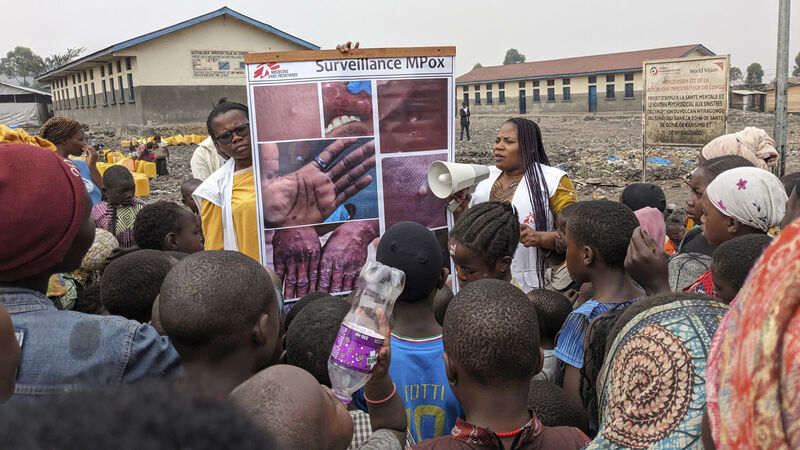 This photo supplied by MSF (Doctors Without Borders) dated May 31, 2023, shows health workers educating children on the symptoms of the mpox disease in Goma, Congo. Picture: Augustin Mudiayi/Doctors Without Borders/Médecins Sans Frontières via AP